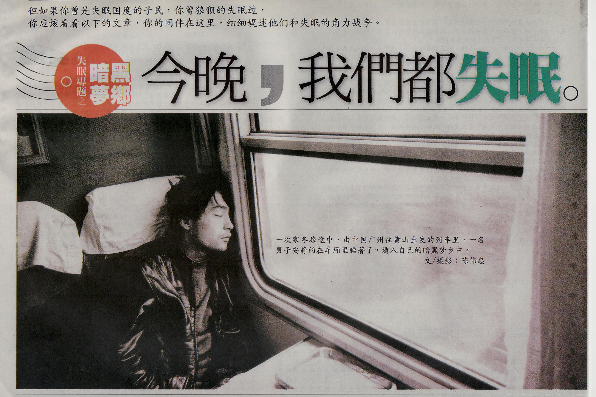 距離、冷空氣、搖晃的車廂,以及窗外不斷移動的景物……2008年,馬來西亞星洲日報,使用了這張照片作為失眠專題的封面。