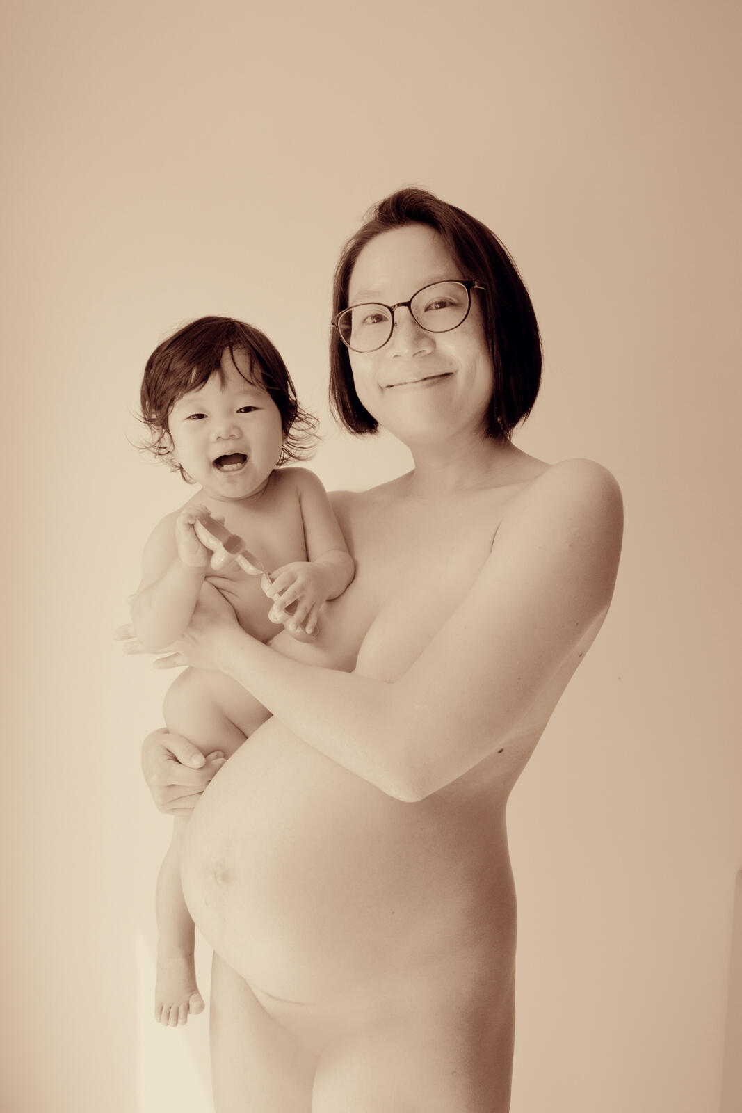 在兩年間,我在同一個地點,用同一種方式拍攝妻子在臨盆前一刻的體態。